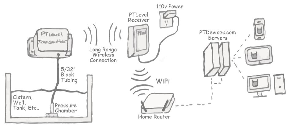 PTLevel WiFi Simple InstallationPower the PTLevel - Use the supplied power supply, run a low voltage wire, or use a POE power splitter to power the PTLevel without worries of managing batteries.Connect the WiFi - Using the simple step by step WiFi connection setup, get the PTLevel connected to the internet through your WiFi connection.Install PTLevel - Install the PTLevel on the tank, drop the pressure chamber in the liquid, and finally connect the power cable.Check Tank Levels When and Where You Want Your Tank, Your Data on Any Web Enabled Device |